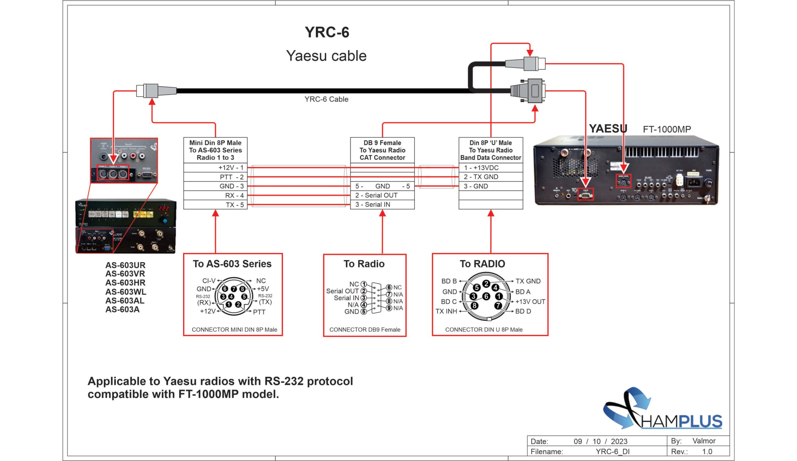 Cable for Hamplus antenna switch AS-603A,  AS-603AL, AS-603ALS, AS-603WL, AS-603HR  and Yaesu radios with RS-232.